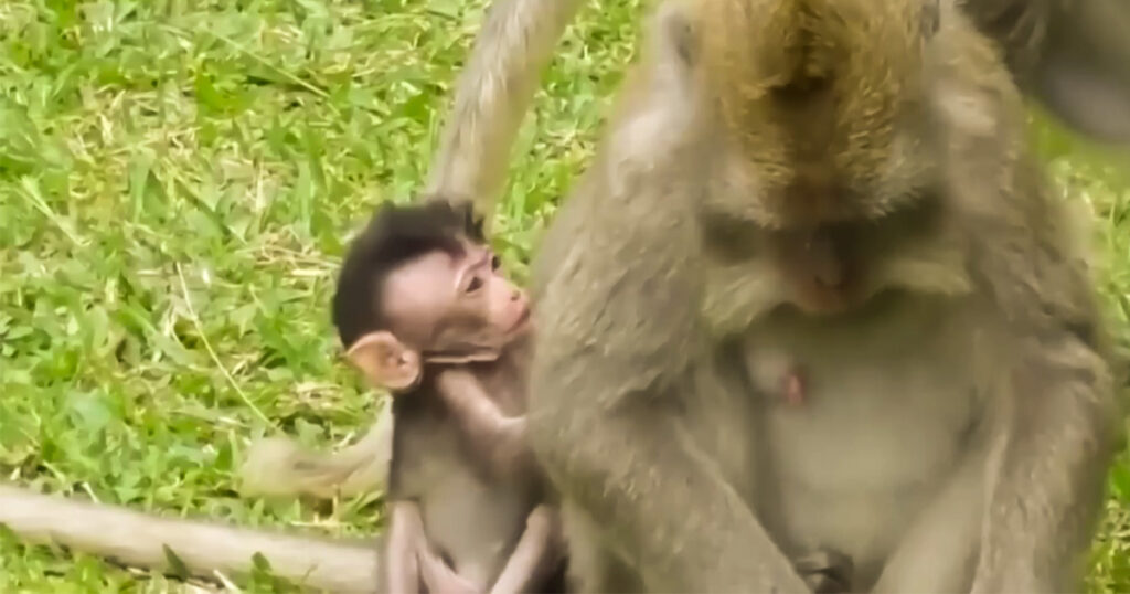 In the early morning light near the Angkor Wat forest trail, a tiny monkey sat beside a row of weathered stones. The older monkeys had already moved deeper into the trees, but this small one stayed behind. He looked too young to travel far alone. Every few minutes, he turned toward the same path, watching carefully as if expecting someone to return.