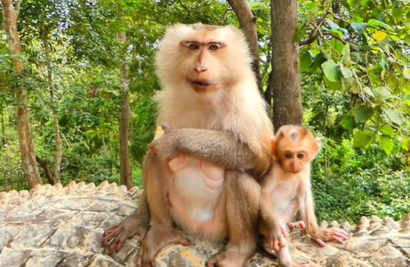 In the soft, golden light of an early morning at Angkor Wat, the forest felt calm—as if nature had pressed a gentle pause button. The wind barely moved. Even the birds seemed to whisper. And then, from behind a moss-covered stone, came a sound—crunch… crunch… crunch… A mother monkey had found her breakfast.