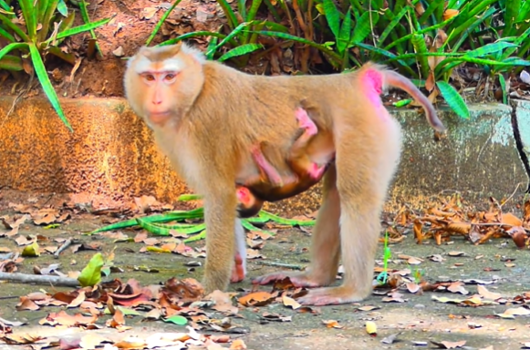 There, not twenty feet from me, stood Mama Monkey, her fur glistening faintly with dew, her eyes wide with a mixture of exhaustion and fierce love. Clutched tightly in her arms was her little baby — so young, so delicate, still trusting the world completely. But what she did next made me gasp: she gently placed the baby not just on her belly, but under her own arm, tucking it close like a hidden secret, shielding it from view, almost as though she were hiding it from something unseen.