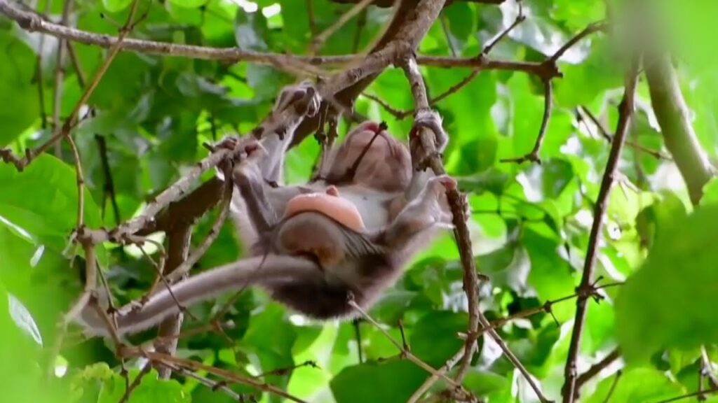 There she was — a tiny baby monkey, no bigger than a small bundle of leaves, curled around the smooth bark of a tree stump. Her limbs were trembling, her eyes wide with fear, and every now and then, she’d reach out and clutch the trunk like it was her only lifeline.