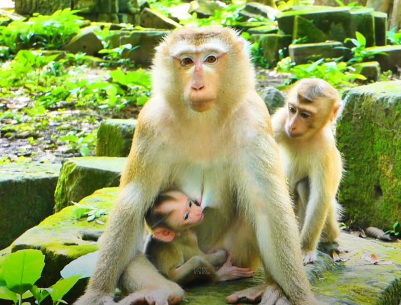 It started as one of those quiet forest mornings—the kind that fills you with a strange kind of peace, just watching life unfold among the trees. I was sitting on the edge of the old path near Angkor Wat, camera in hand, when I noticed Jenifer, one of the more nurturing young females in the troop, gently grooming little Lynx.