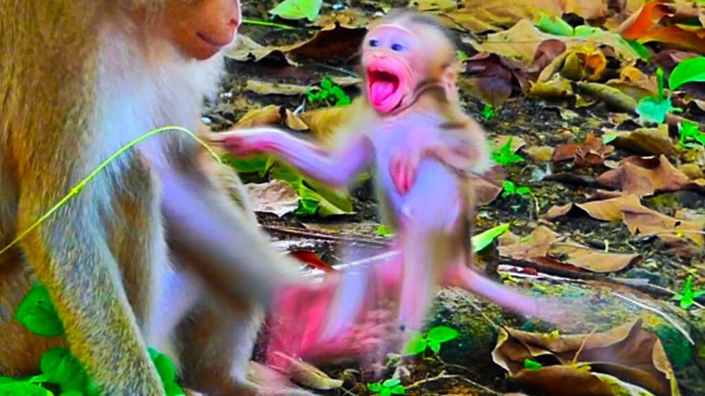 His mother remained seated on a low stone ledge, her posture calm and unhurried. She watched him with steady eyes, neither reaching nor turning away. To the baby, that distance felt unbearable. His cries grew louder, not from fear alone, but from something deeper—confusion, protest, the sudden realization that closeness was no longer guaranteed.