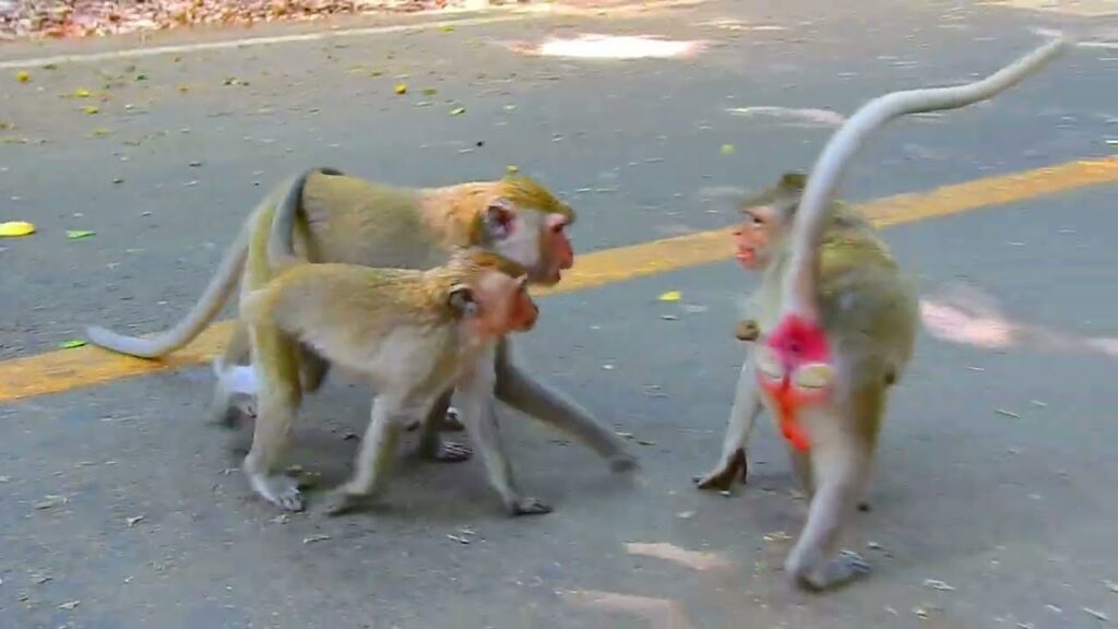 Her body stiffened. Her eyes sharpened. She stepped forward without hesitation, positioning herself between the monkey and the child. Her voice became firm, controlled, serious.
