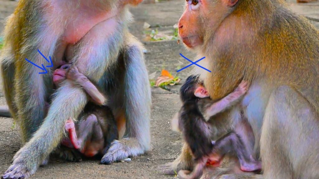 An older mother monkey perched on a moss-covered ledge, her tiny newborn clinging tightly to her chest. The baby’s movements were small but urgent—nudging, searching, trying to nurse. But each time the infant tried to latch on, the mother shifted away.